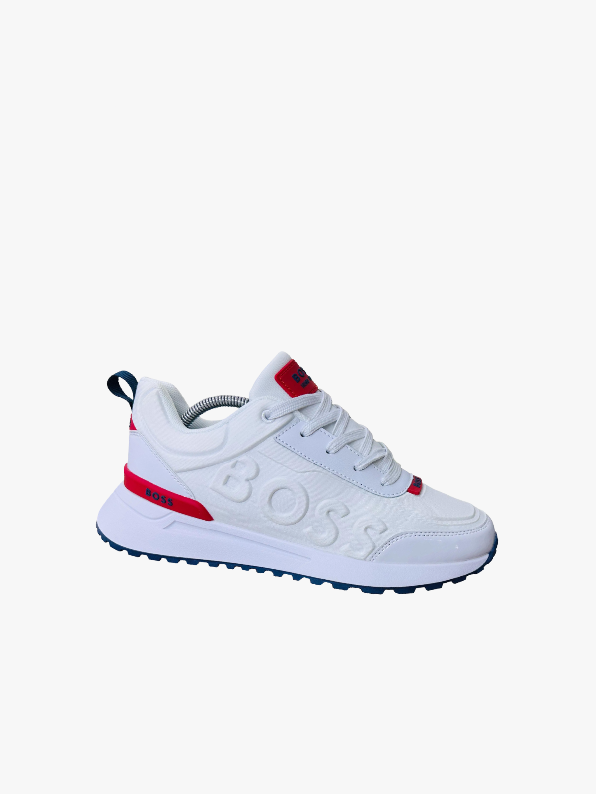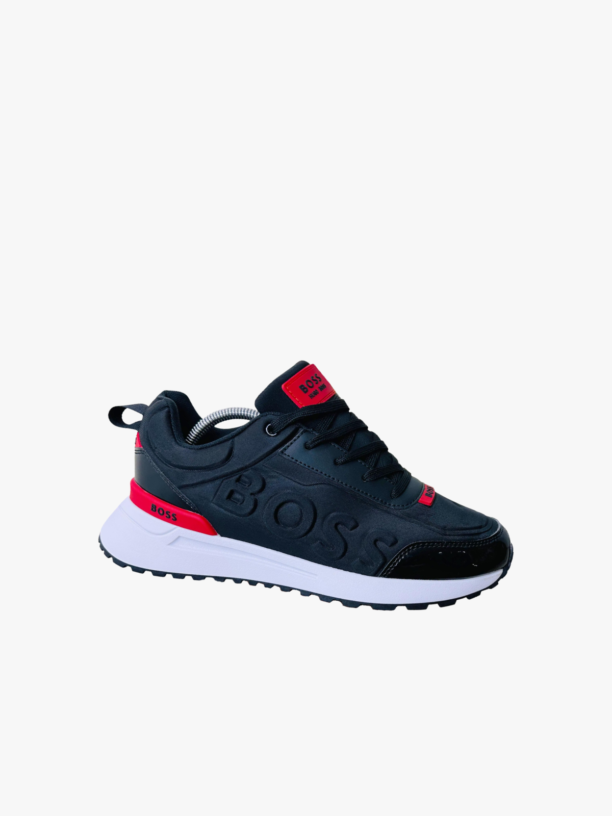 Fabricadas con materiales de alta gama, estas zapatillas destacan por su estructura sólida y estética refinada. El color negro dominante les otorga un aire minimalista, mientras que los detalles en rojo en la lengüeta y el talón aportan un contraste vibrante y distintivo. En el lateral exterior se encuentra la inscripción en alto relieve “BOSS”, que refuerza la autenticidad del calzado sin exageraciones.